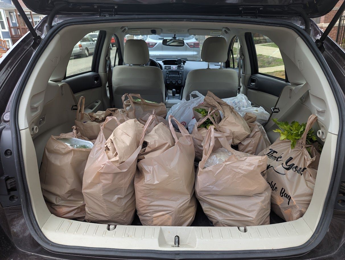 Once I have my stops plugged into Circuit I’m ready to go! When I pull into the warehouse loading area, someone greets me and yells “Jes, Logan!” so that the volunteers can look me up on the whiteboard to see how many grocery bags I get, plus supplementals. Then our volunteers load up my car with the goods, though I usually help them carry some bags, especially if people are busy doing other things.